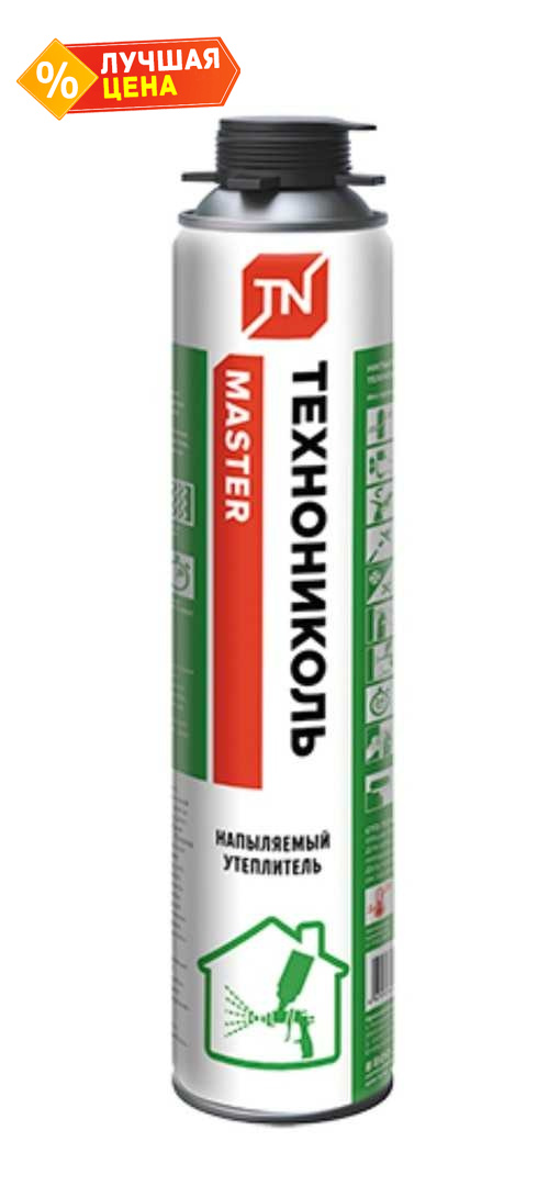 Напыляемый утеплитель ТЕХНОНИКОЛЬ MASTER это напыляемая однокомпонентная полиуретановая теплоизоляция. Наносится методом напыления с помощью специальной насадки для стандартного монтажного пистолета (поставляется в комплекте). После отверждения формирует бесшовное теплозвукоизоляционное покрытие с равномерной мелкопористой структурой. Характеризуется отличной адгезией к различным поверхностям (бетон, кирпич, дерево, металл и пр.), имеет низкую теплопроводность.